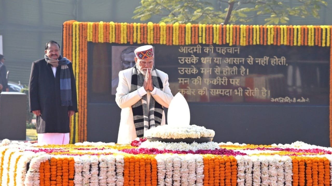दिल्ली: प्रधानमंत्री नरेंद्र मोदी समेत कई अन्य बीजेपी नेताओं ने पूर्व पीएम अटल बिहारी वाजपेयी को उनकी 101वीं जयंती पर दिल्ली में ‘सदैव अटल’ स्मारक पर पुष्पांजलि अर्पित की. इस दौरान राष्ट्रपति द्रौपदी मुर्मू, उपराष्ट्रपति सीपी राधाकृष्णन समेत कई दिग्गज मौजूद रहे. अटल बिहारी वाजपेयी का जन्म 25 दिसंबर, 1924 को ग्वालियर, मध्य प्रदेश में हुआ था.